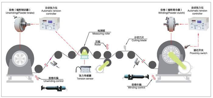 由于磁粉離合器/制動器具有以上特性,現(xiàn)已廣泛就用于造紙、印刷、塑料、橡膠、紡織、印染、電線電纜、冶金以及其他相關(guān)卷取加工行業(yè)中收卷和放卷張力的控制。下面是一套較為完整的張力控制系統(tǒng)示意圖。