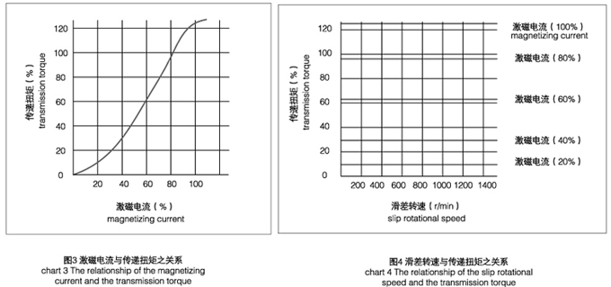 如圖3所示,傳遞的轉(zhuǎn)矩與激磁電流基本成線性關(guān)系。只要改變激磁電流的大小,便可在較大范圍內(nèi)控制轉(zhuǎn)矩的大小。一般情況下在5%-100%的額定轉(zhuǎn)矩范圍內(nèi),激磁電流與傳遞轉(zhuǎn)矩基本成正比例線性關(guān)系。