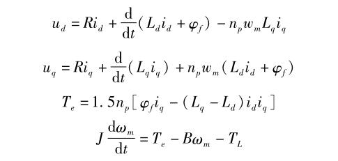 式中 , R 為定子繞組電阻 ; i d 、 i q 為 dq 軸定子電流 ; L d 、 L q 為 dq 軸定子電感 ; 為轉(zhuǎn)子上的永磁體產(chǎn)生的磁鏈 ; ω m 為轉(zhuǎn)子角速度 ; n p 為極對數(shù) ; B 為電機黏滯摩擦系數(shù) ; J 為電機轉(zhuǎn)動慣量 ; T L 為負載轉(zhuǎn)矩 。