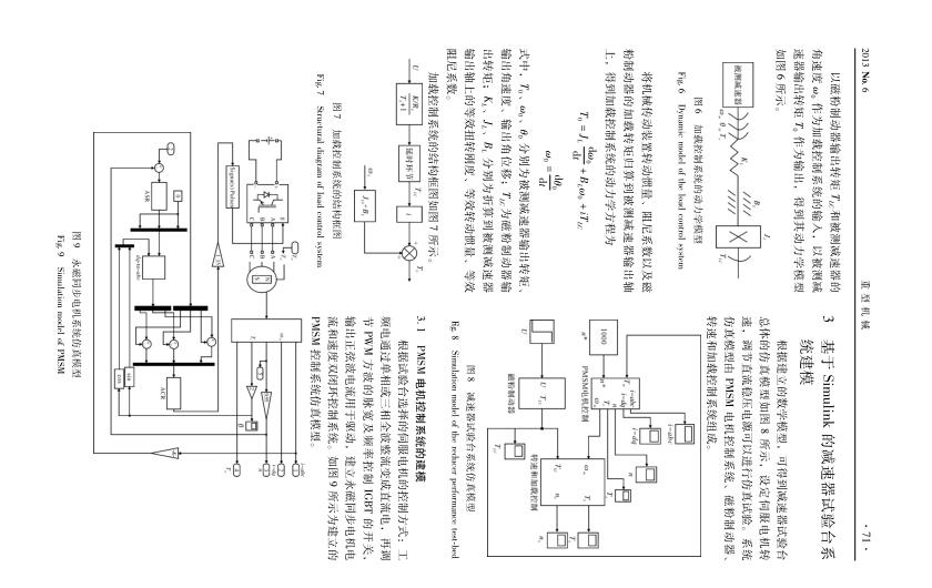 本文通過建立減速器性能測試試驗臺各組成部分的數(shù)學(xué)模型 , 利用 Simulink 對系統(tǒng)仿真模型進行過渡過程 、 空載和加載情況下的仿真試驗 ,得到仿真輸出曲線與實際情況相符 , 說明所建立的系統(tǒng)數(shù)學(xué)模型的正確性 , 且建立的仿真模型有助于進一步分析設(shè)計參數(shù)對系統(tǒng)性能的影響 , 也為減速器性能測試的試驗研究提供理論依據(jù) 。