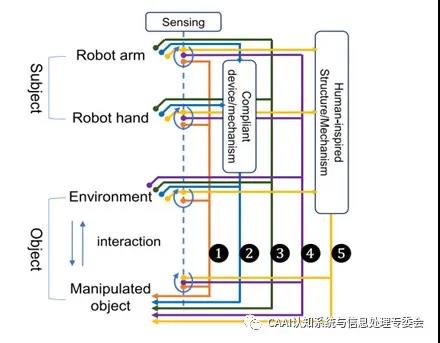 文章介紹了高精度機器人操控的五類方法:(1)基于傳感信息的方法(2)基于柔順機構(gòu)的方法(3)基于環(huán)境約束的方法(4)基于感知約束集成的方法(5)仿生的方法。如圖1所示,示意圖展示了五類方法之間的差異。在機器人操控中,主體是機器人的手臂和手,客體是環(huán)境和被操控的對象。虛線表示傳感信息,回路表示傳感器感知到的最新狀態(tài)。